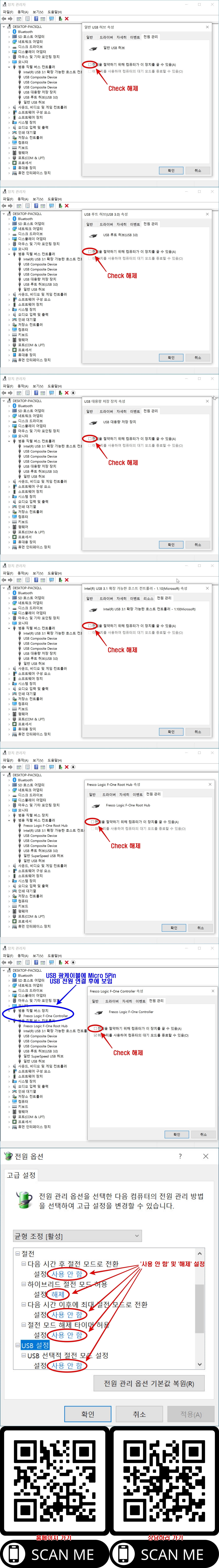 위해 장치관리자에서 아래 절전 옵션을 해제하여 사용하시길 권장합니다.