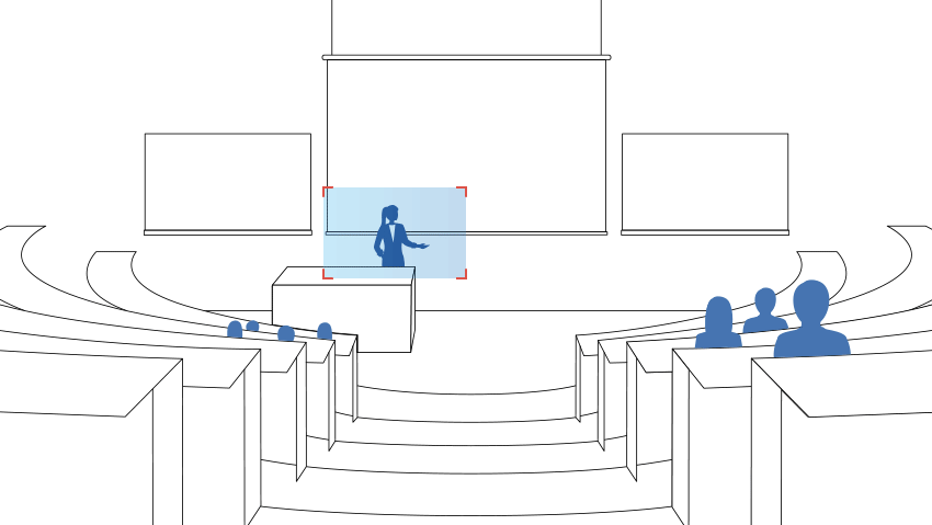 발표자를 자연스럽게 추적하다가 지정된 영역에 진입 시 해당영역에 카메라가 대기합니다.