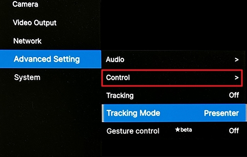 카메라의 IR리모컨의 Menu 버튼을 눌러 TV/모니터 화면에 OSD메뉴를 표시하고 어드밴스드 세팅의 컨트롤 항목을 눌러 설정을 확인합니다.