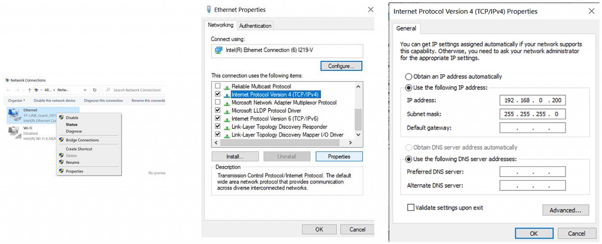 6. PC 또는 노트북의 IP 주소 확인합니다. 제어판의 네트워크 관리자에서 연결된 랜디바이스를 선택하고 "마우스 오른쪽 버튼 클릭"하여 속성을 표시합니다. IPV4, 속성을 선택하고 "다음 IP 주소 사용"을 선택합니다.