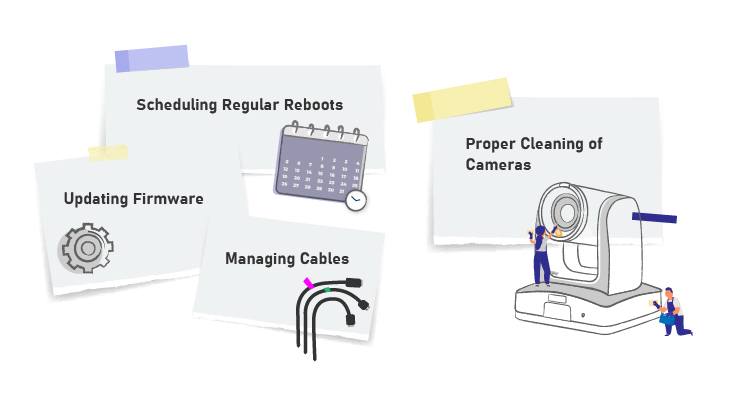 적절한 취급, 전원 껐다 켜기, 정기적인 재부팅, 펌웨어 업데이트, 케이블 관리 및 카메라 청소의 기본 사항을 준수하면 카메라의 기능을